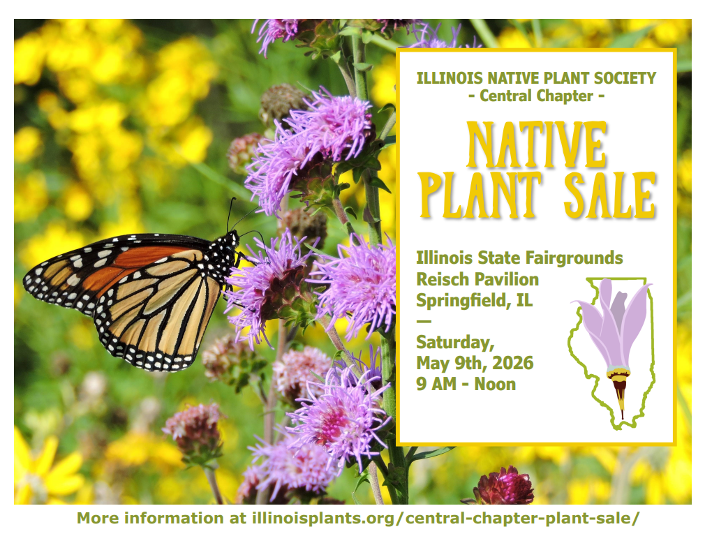 The 2026 INPS Central Chapter Native Plant Sale is set for Saturday, May 9th from 9AM-12PM at the Reisch Pavilion (AKA Food-A-Rama) on the Illinois State Fairgrounds. You can expect a great diversity of native trees, shrubs, and herbaceous plants will be offered to help you create habitat at home. Multiple milkweed species will be offered as well as a great selection of plants for pollinators and wildlife. The plants are grown from local seed sources whenever available by chapter members and local nurseries.